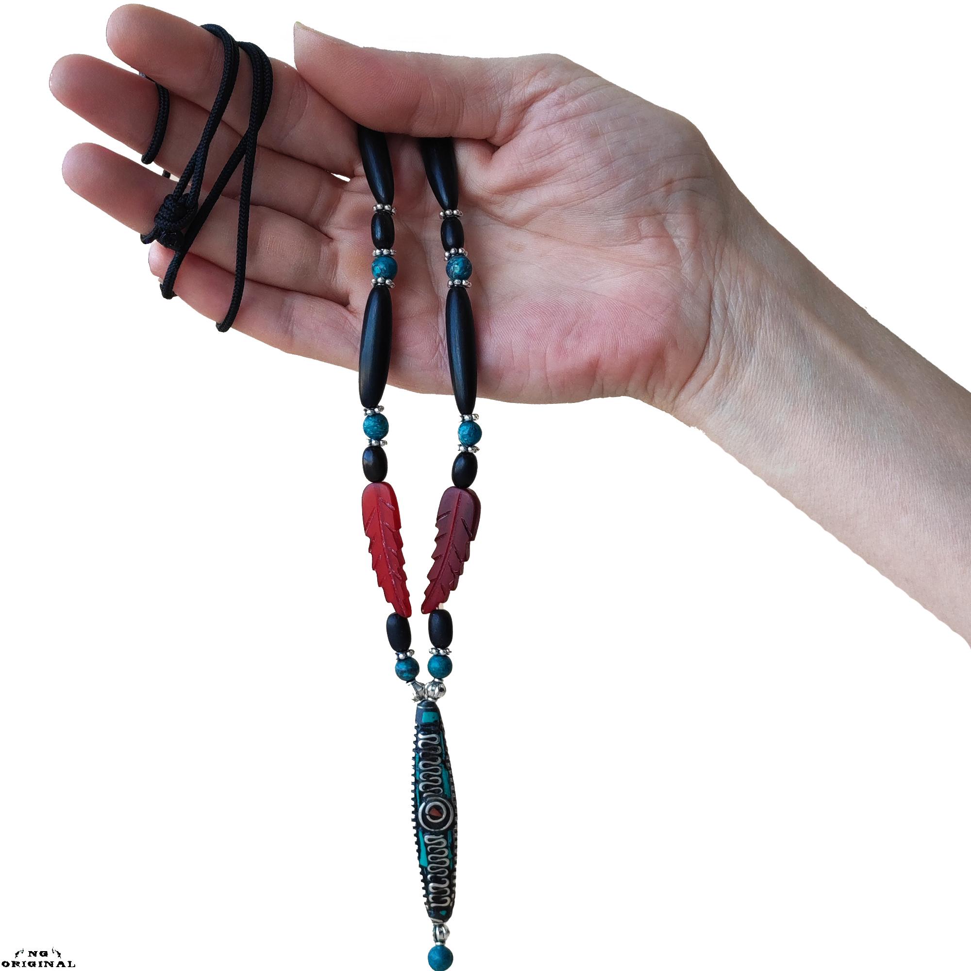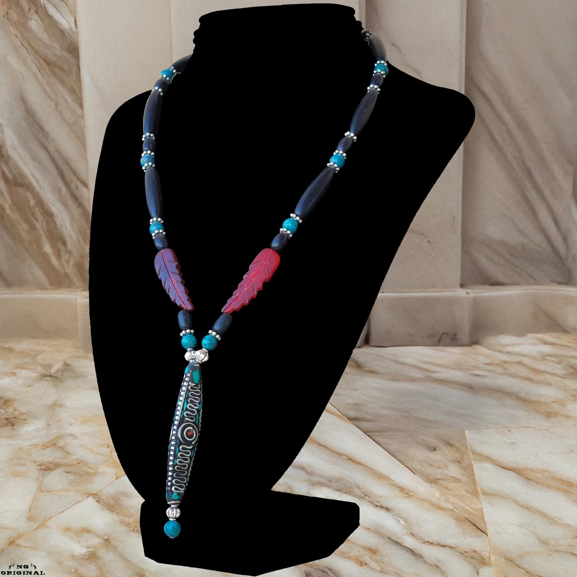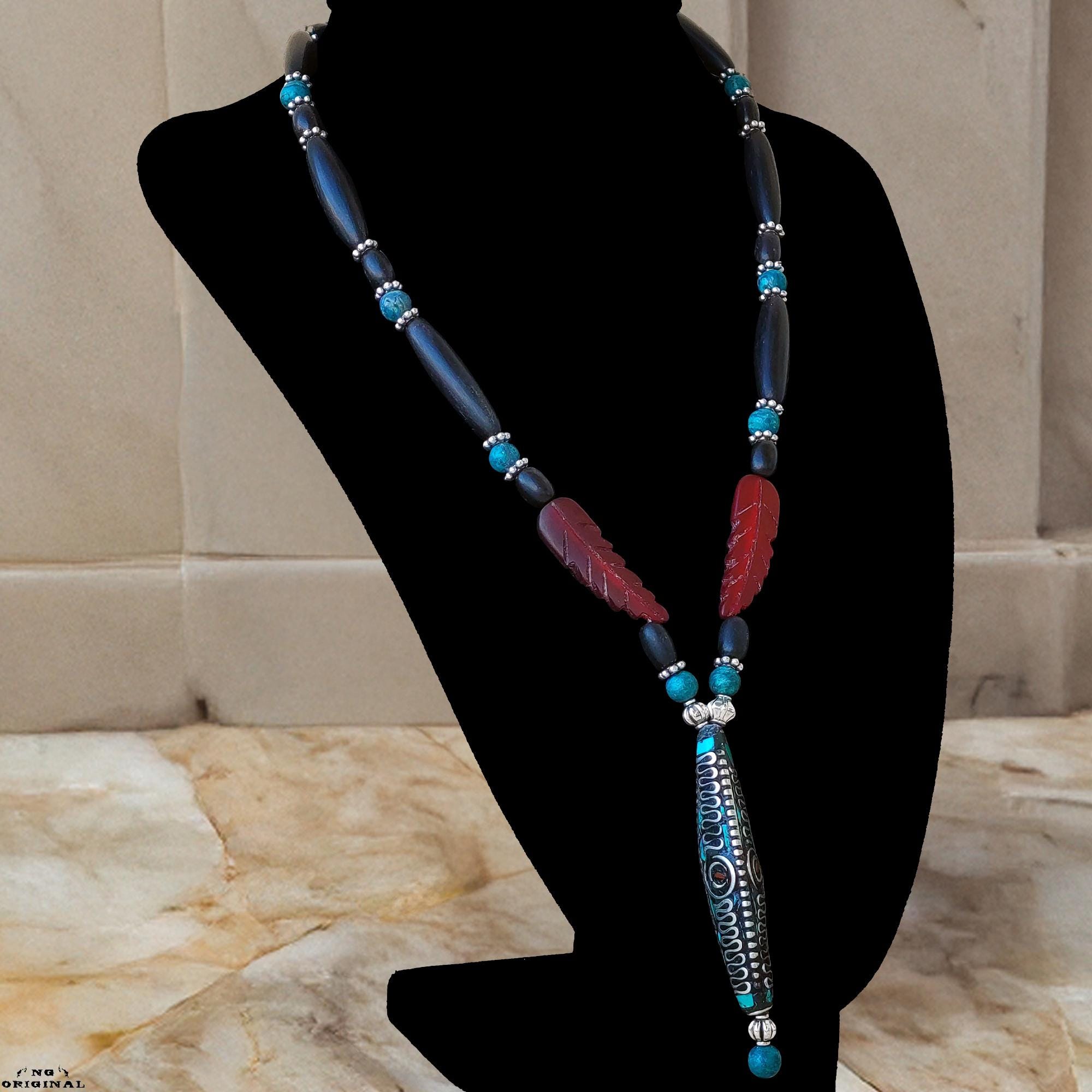 Native American turquoise & red coral necklace Tibetan pendant, tribal handmade jewelry, spiritual talisman, boho chic gift