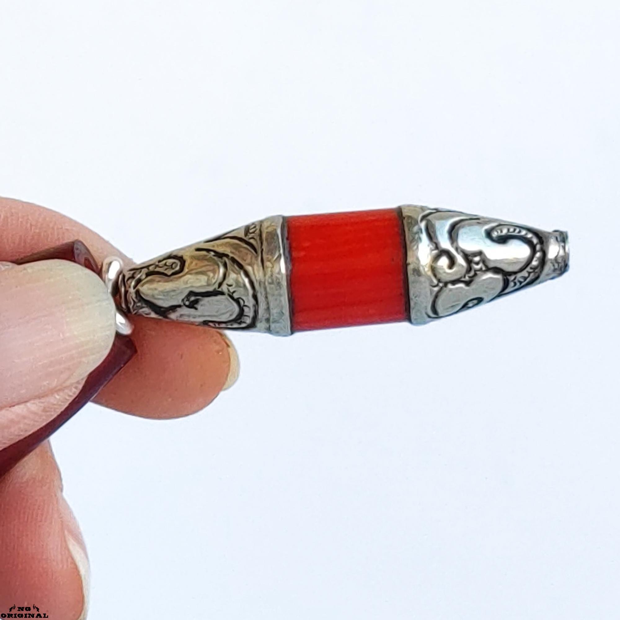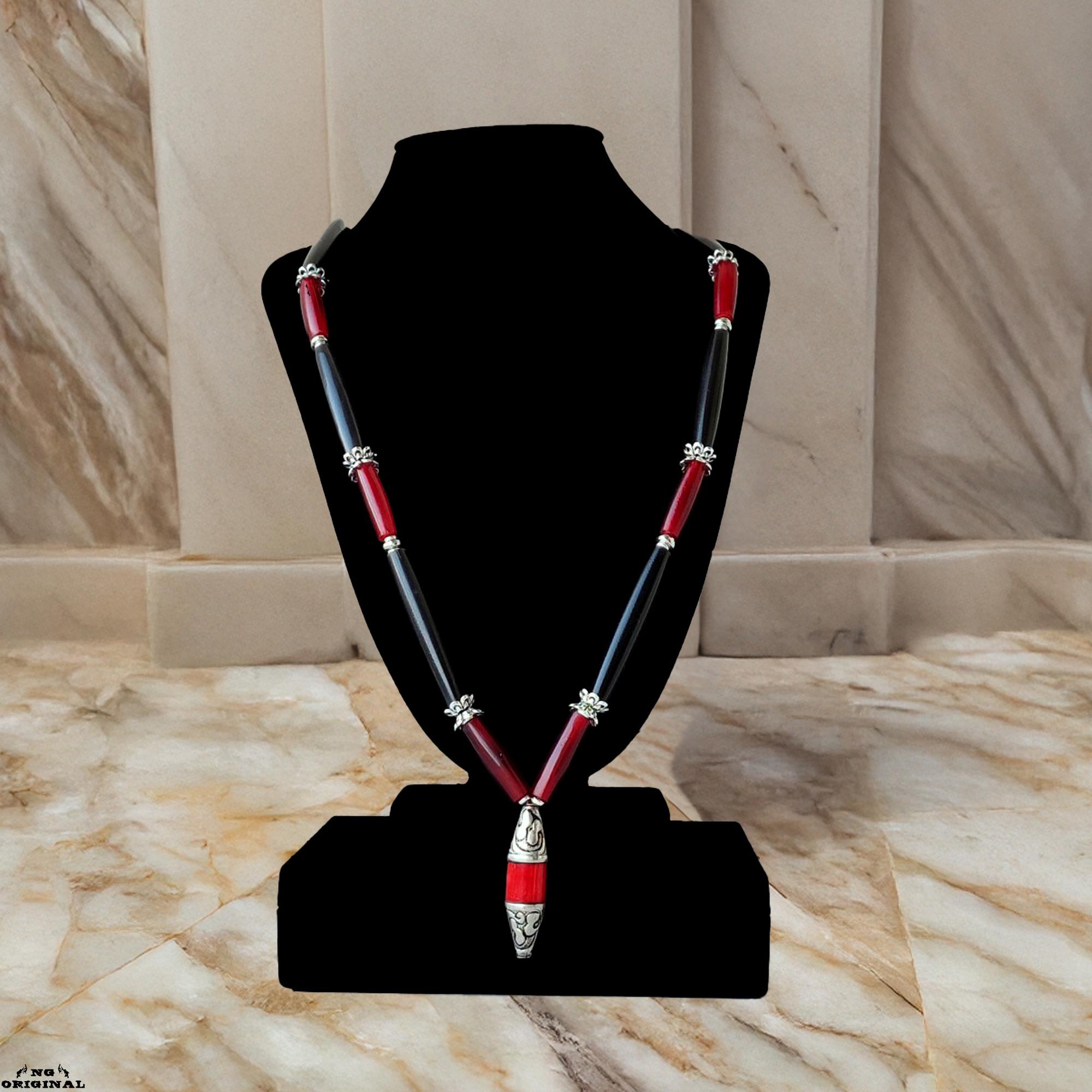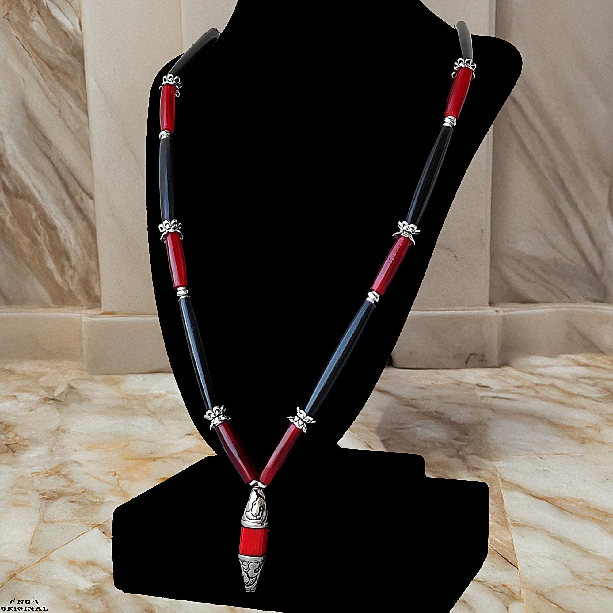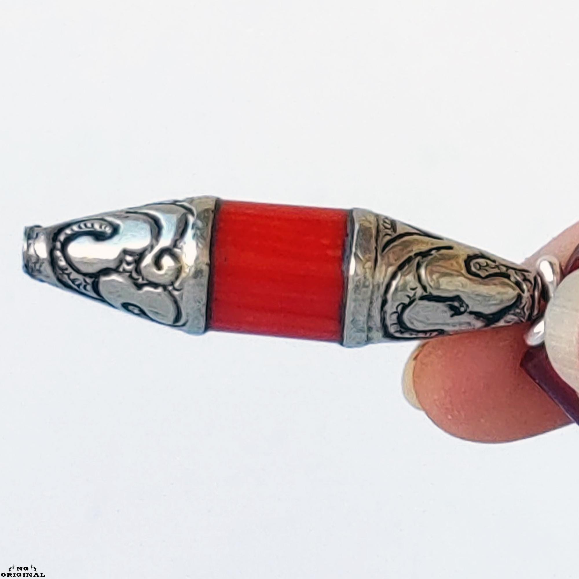 Tibetan pendant: dyed yak bone + engraved silver caps (45 × 10.5 mm).
