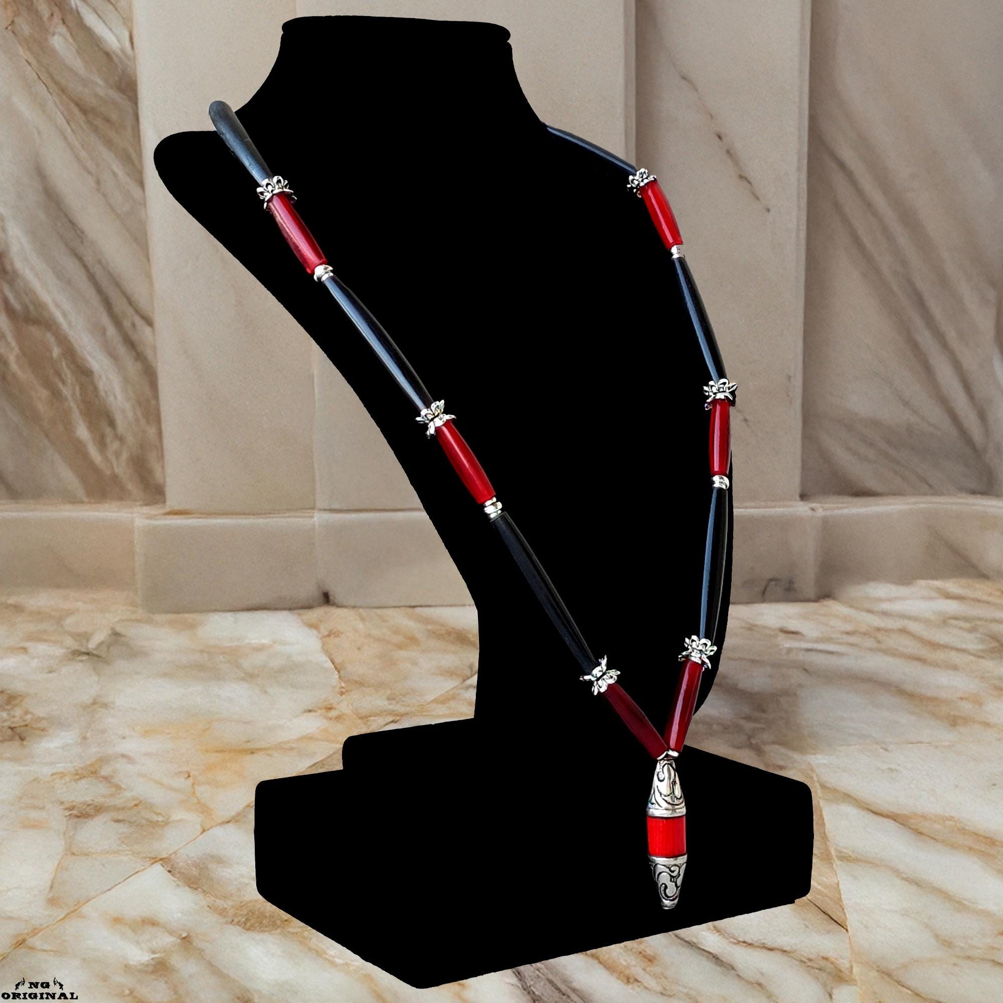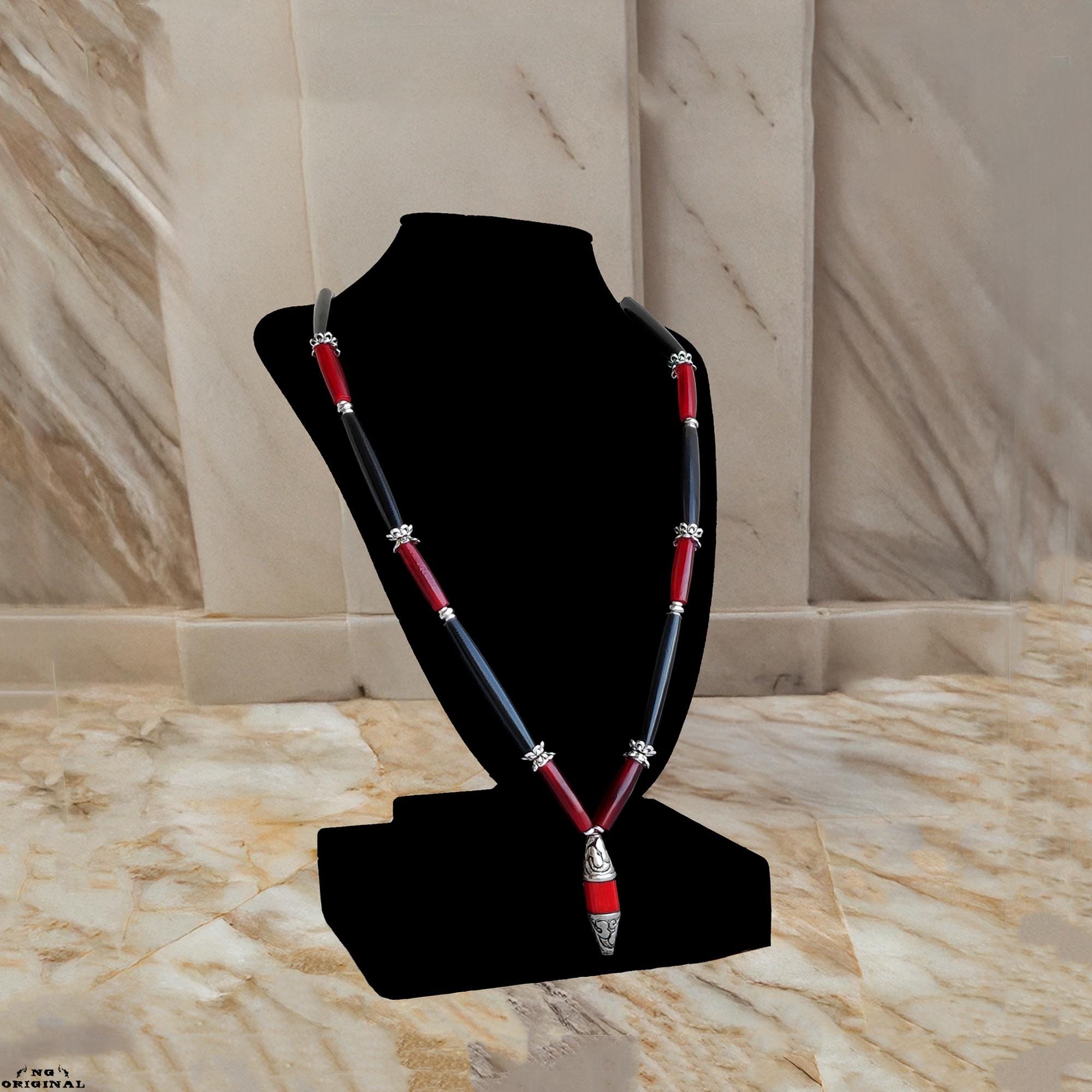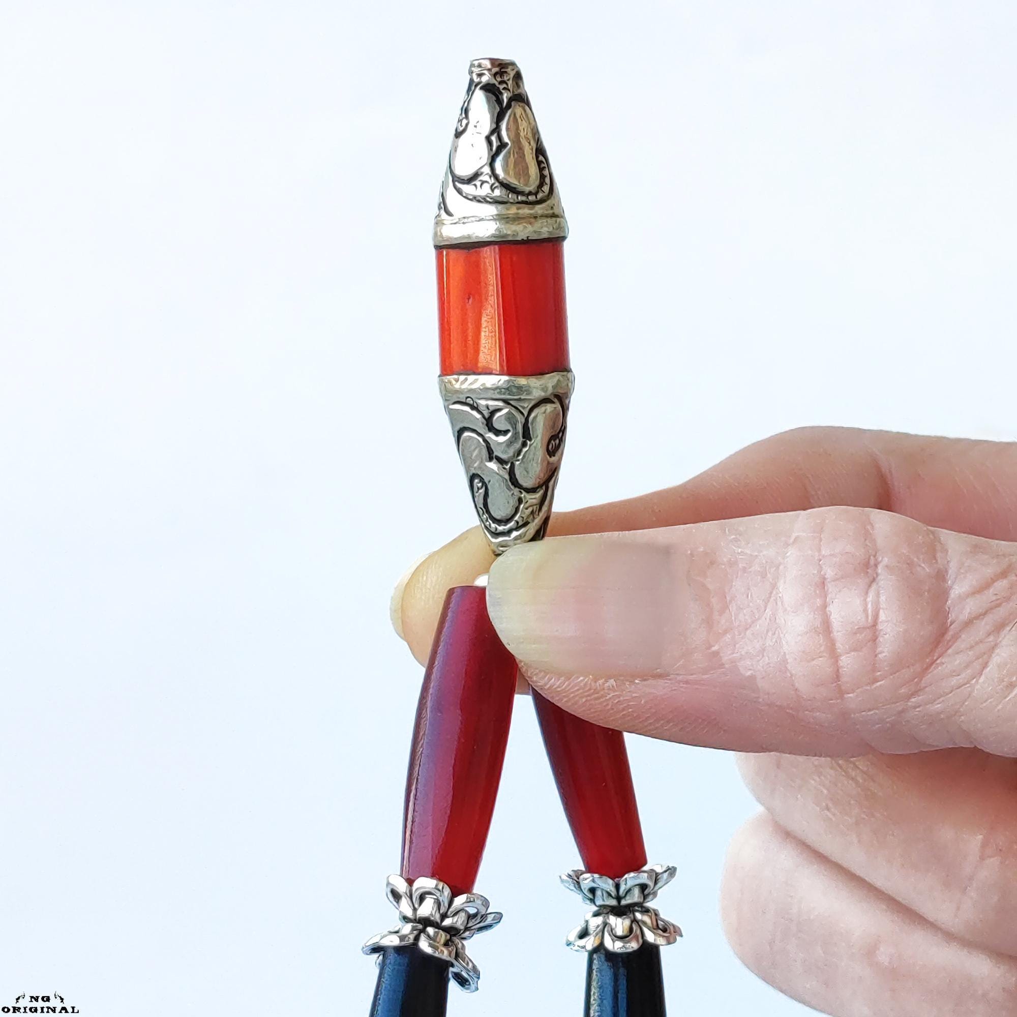 Tibetan pendant: dyed yak bone + engraved silver caps (45 × 10.5 mm).