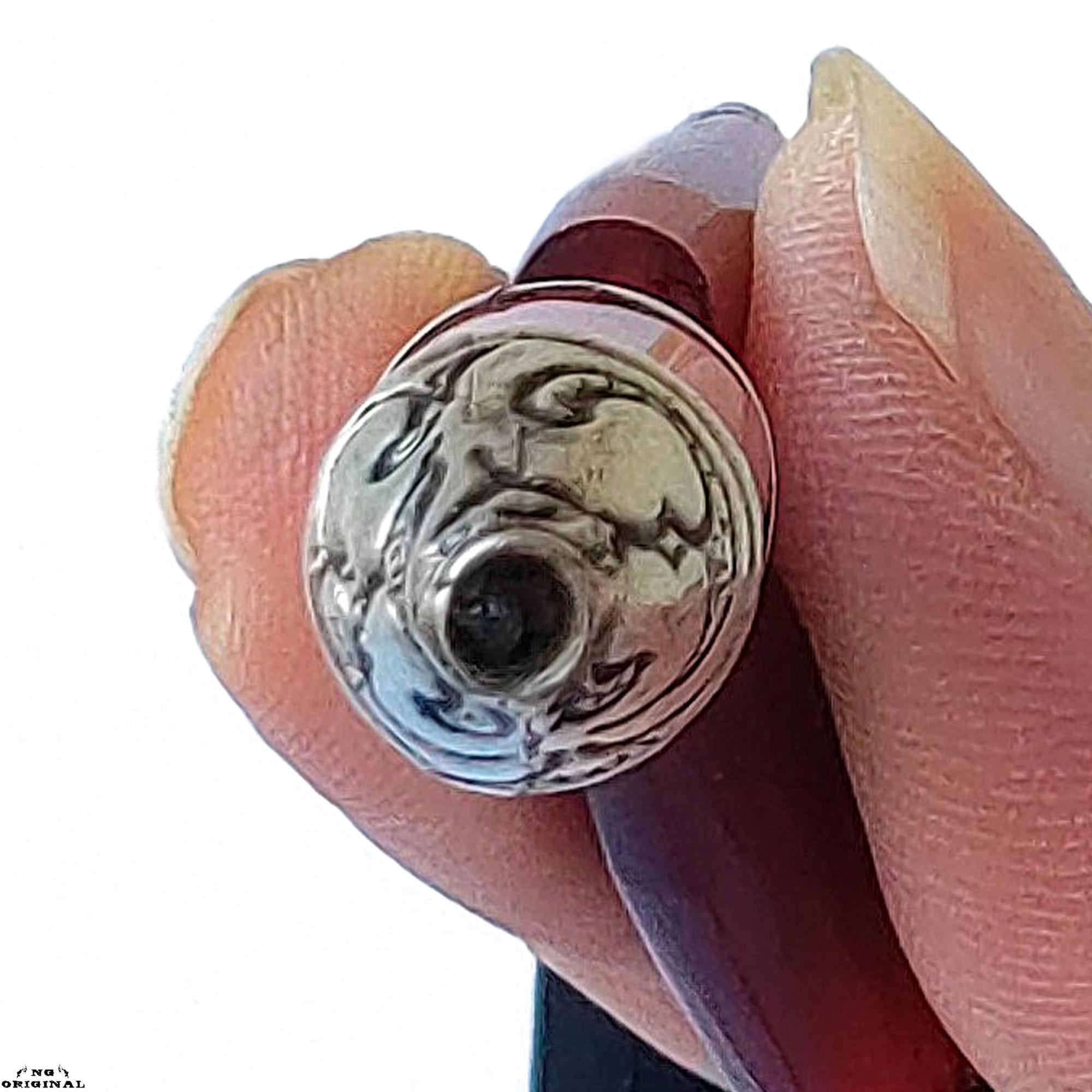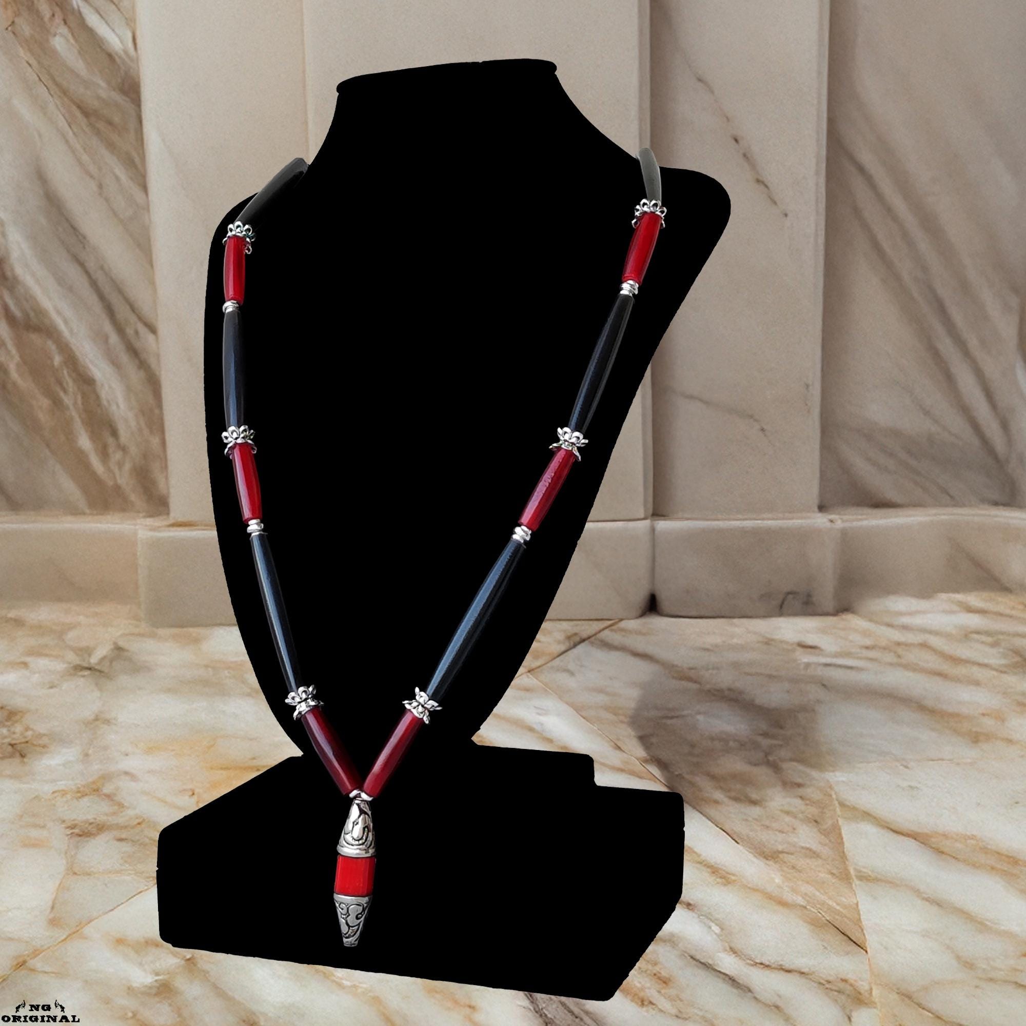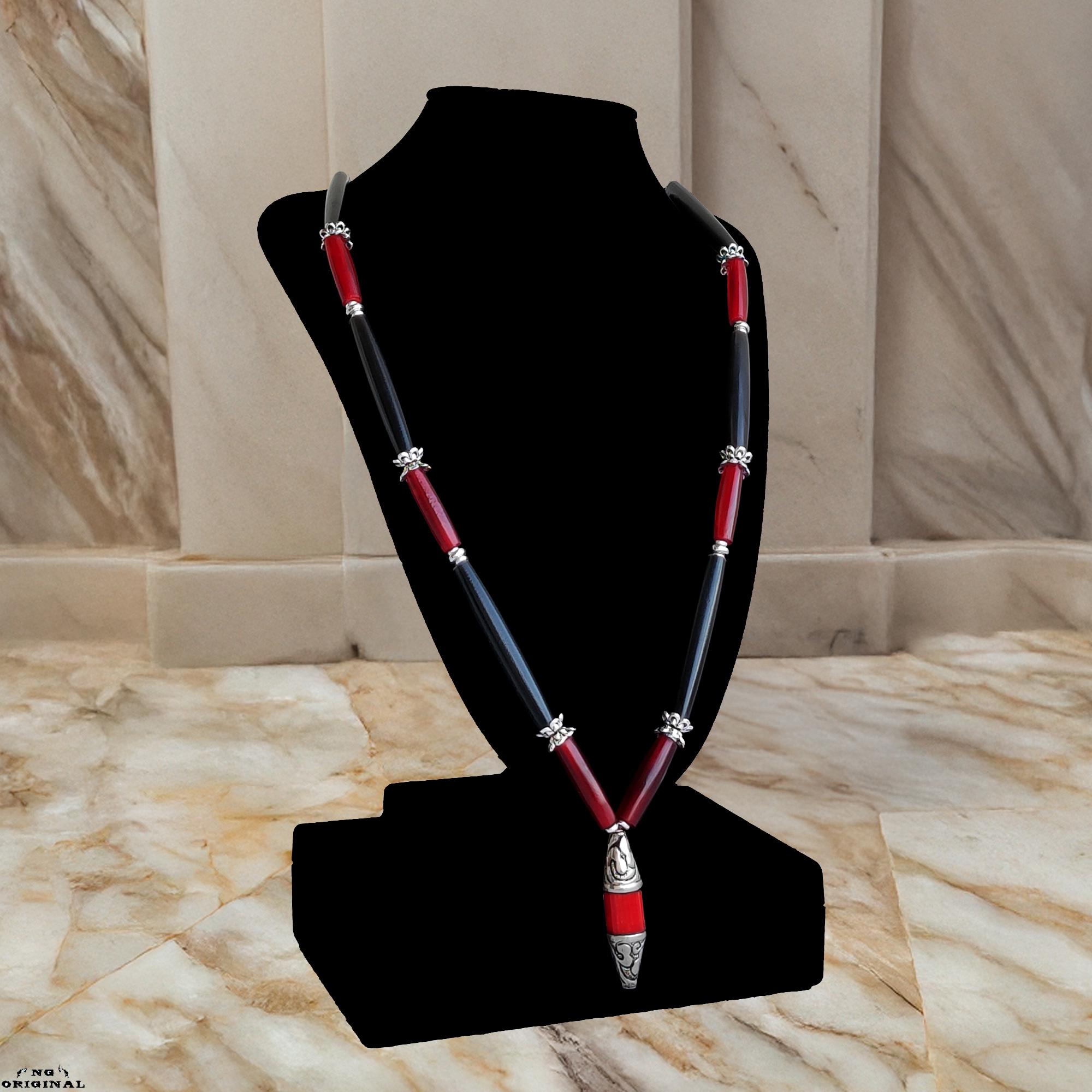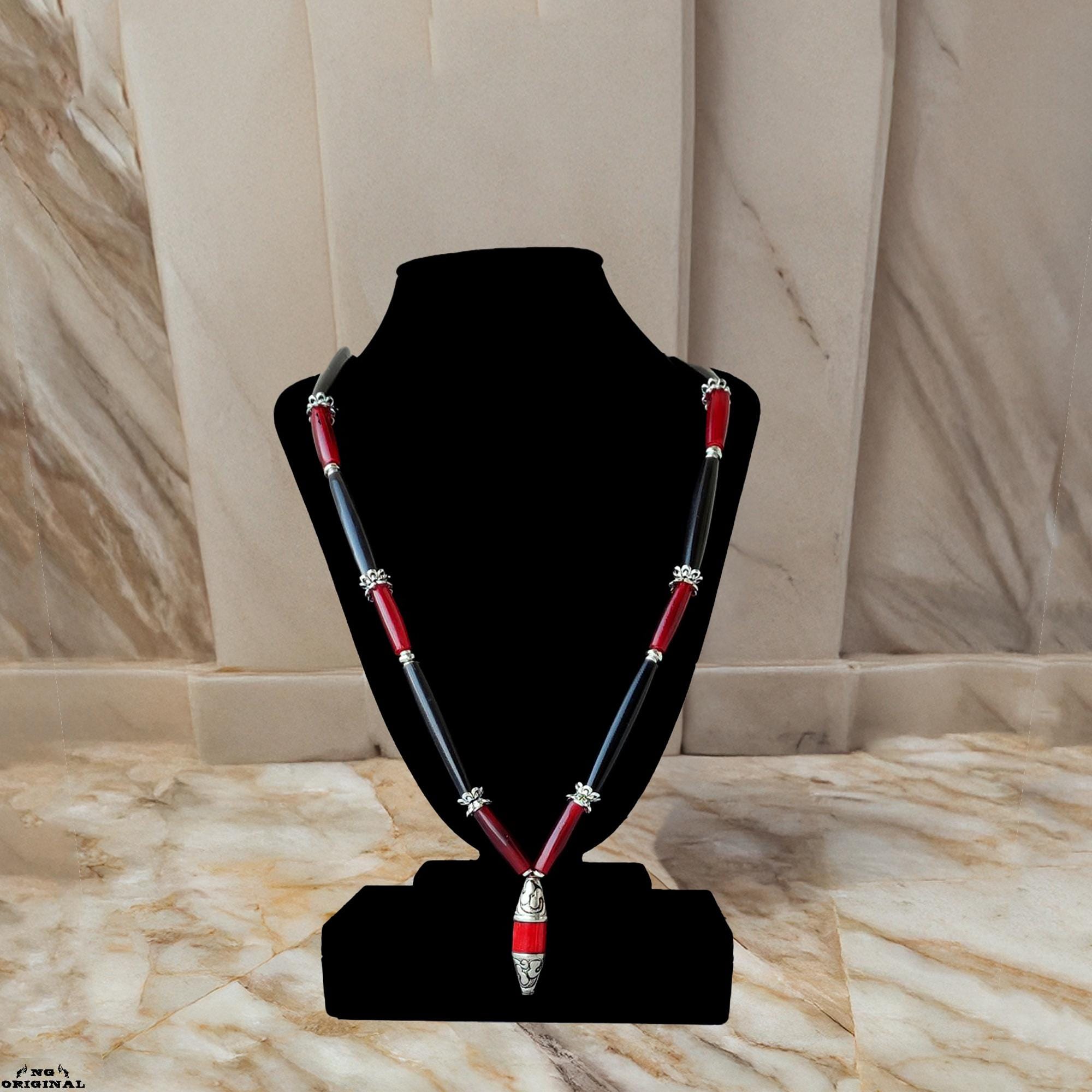 Tibetan pendant: dyed yak bone + engraved silver caps (45 × 10.5 mm).