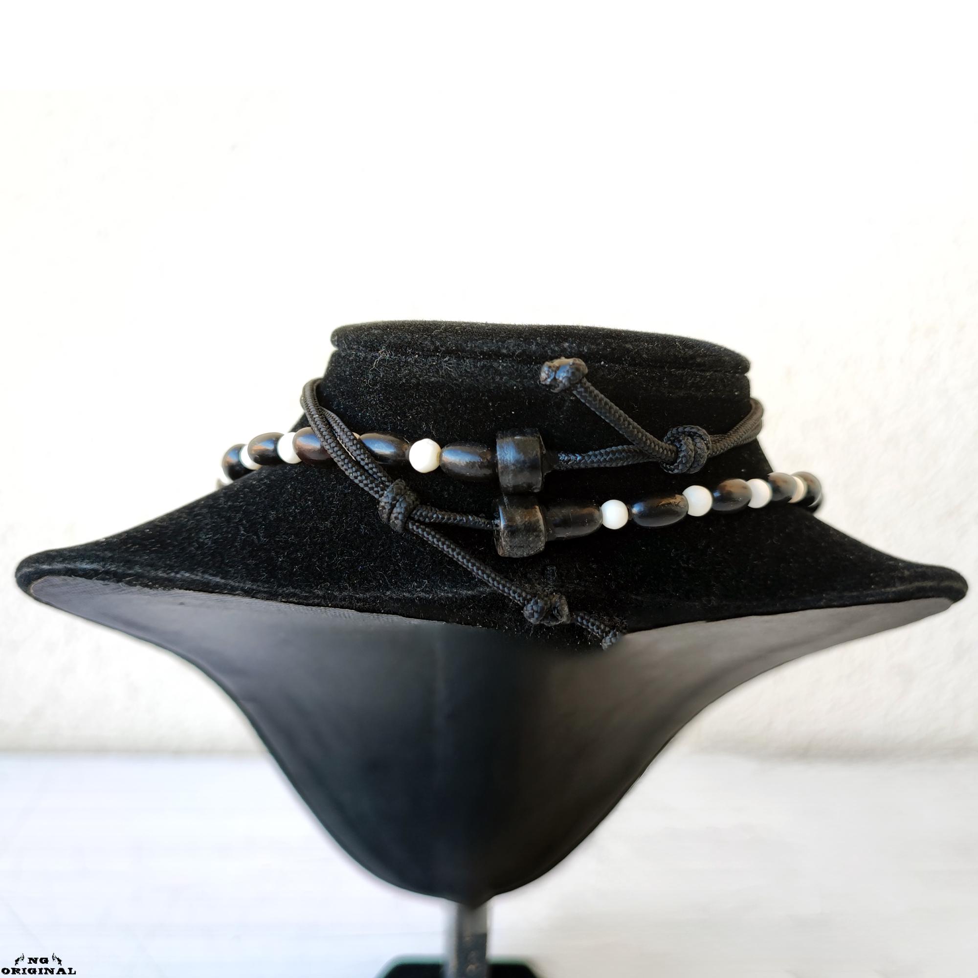 Horn beads, ivory-toned wood, brass accents