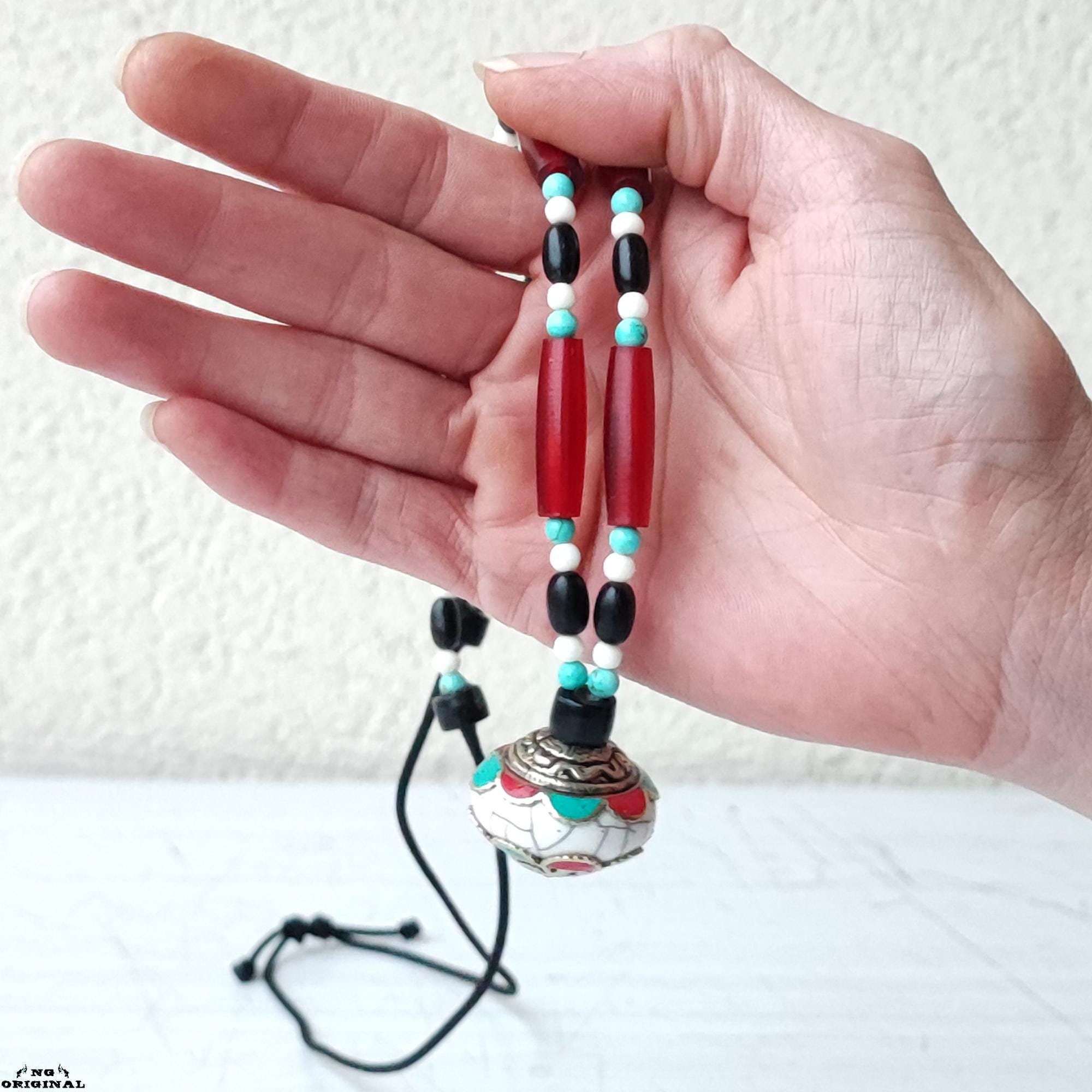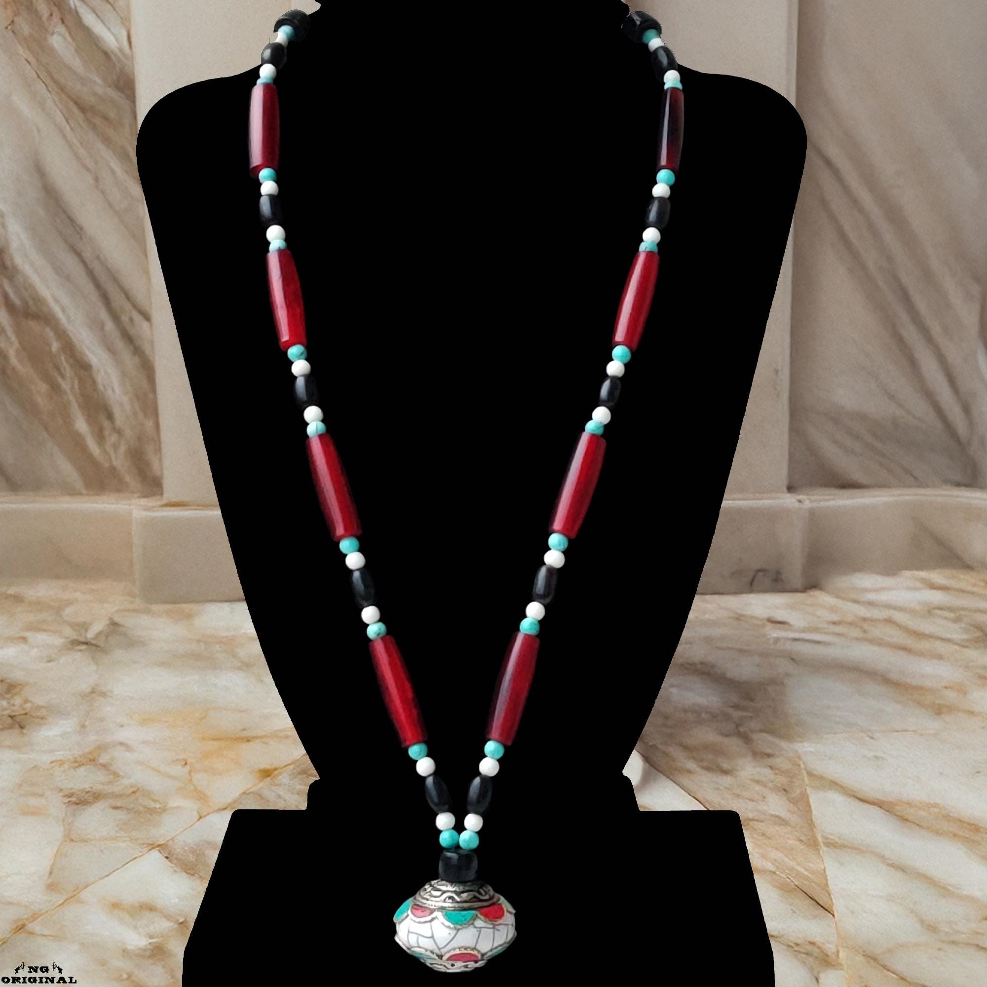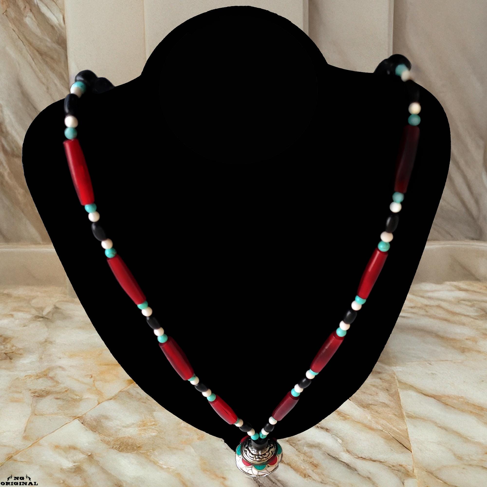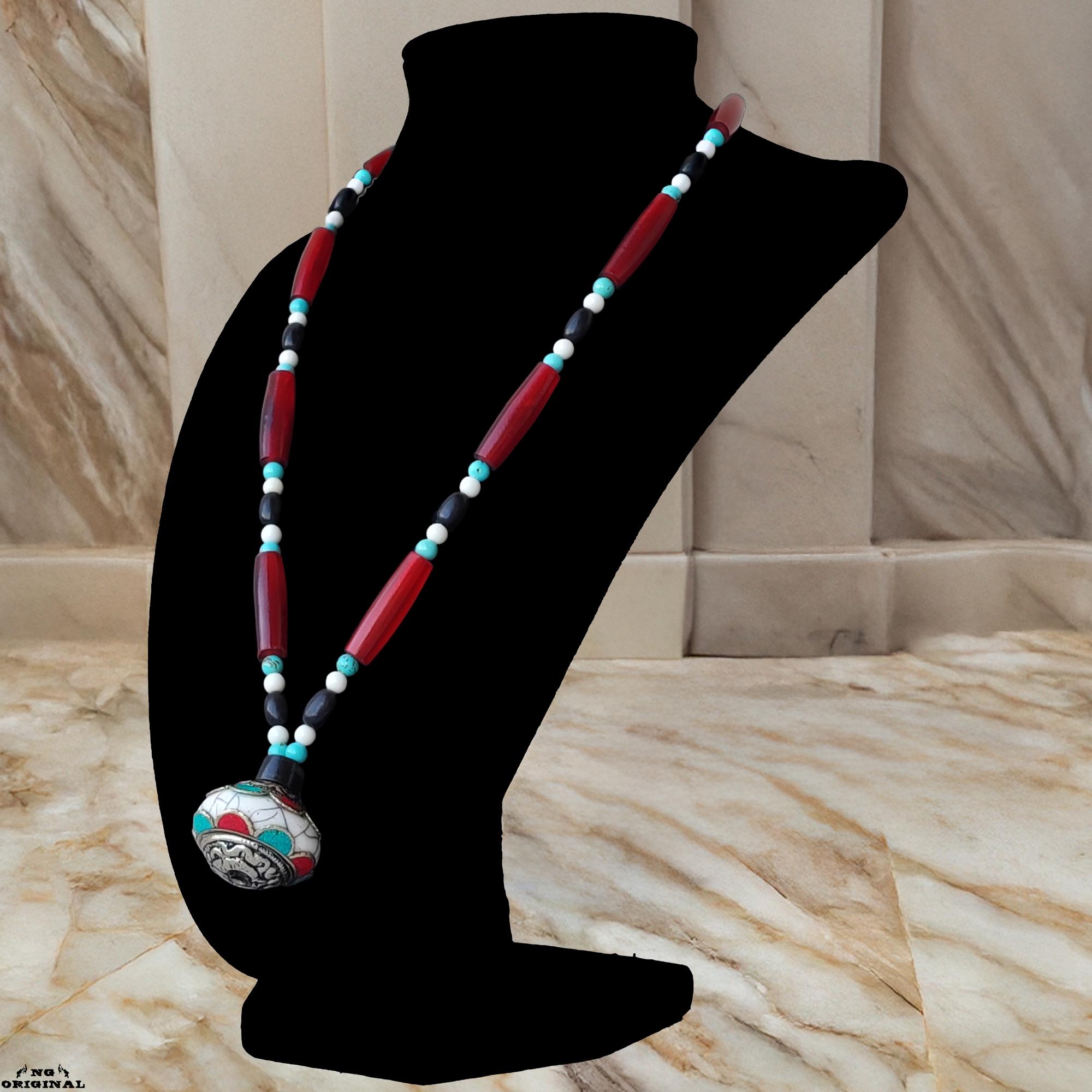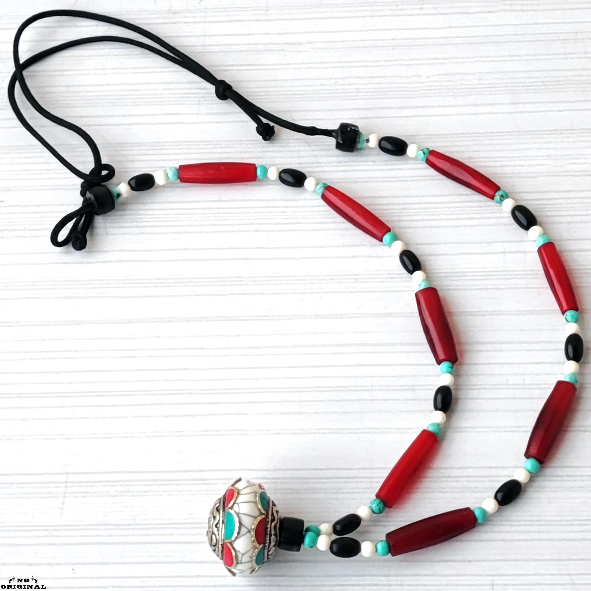 🌿 Premium & sustainable materials: • Black nylon cord ♻️ • Black & red horn beads 🔴⚫ • Ivory-toned wood beads 🌳 • Tibetan repoussé pendant in 925 sterling silver, coral & turquoise 💠