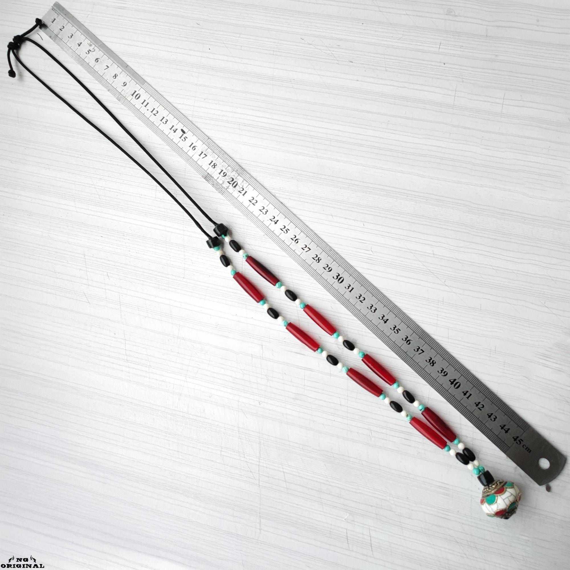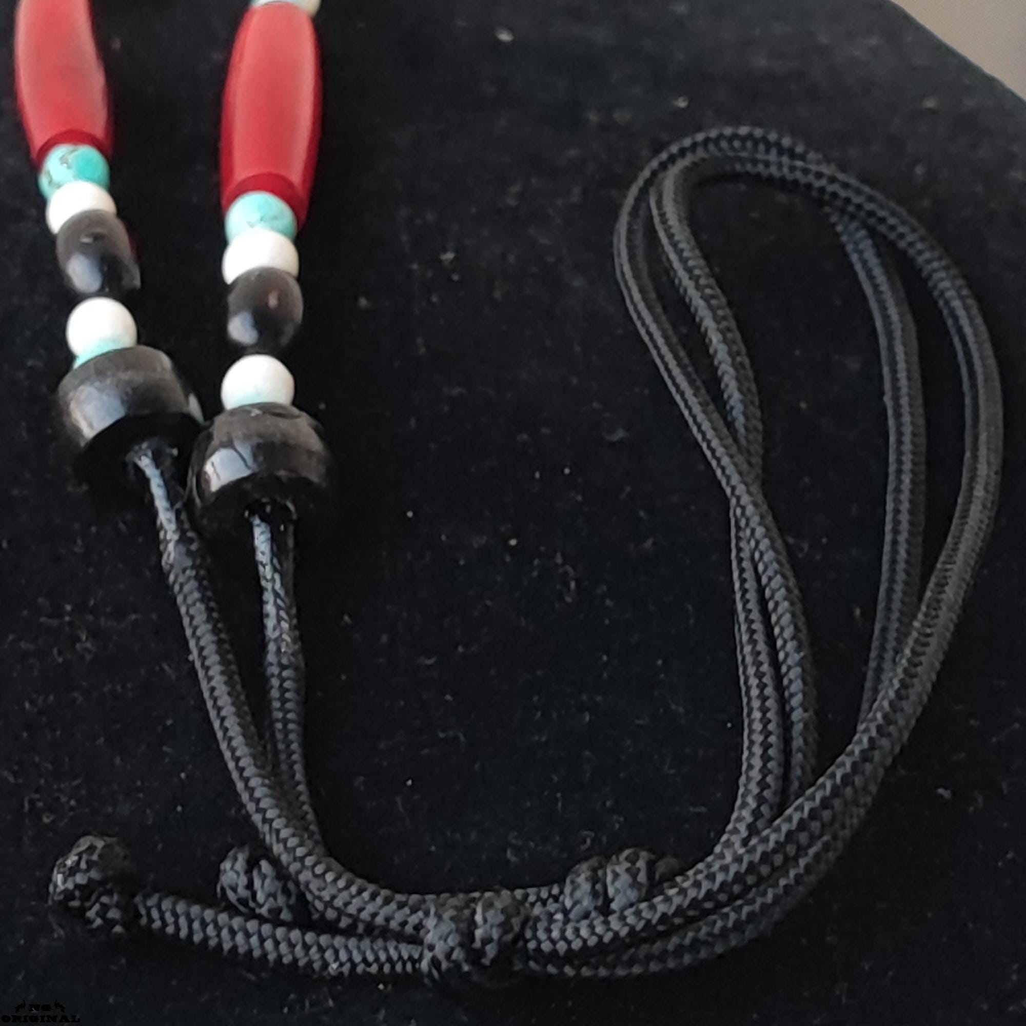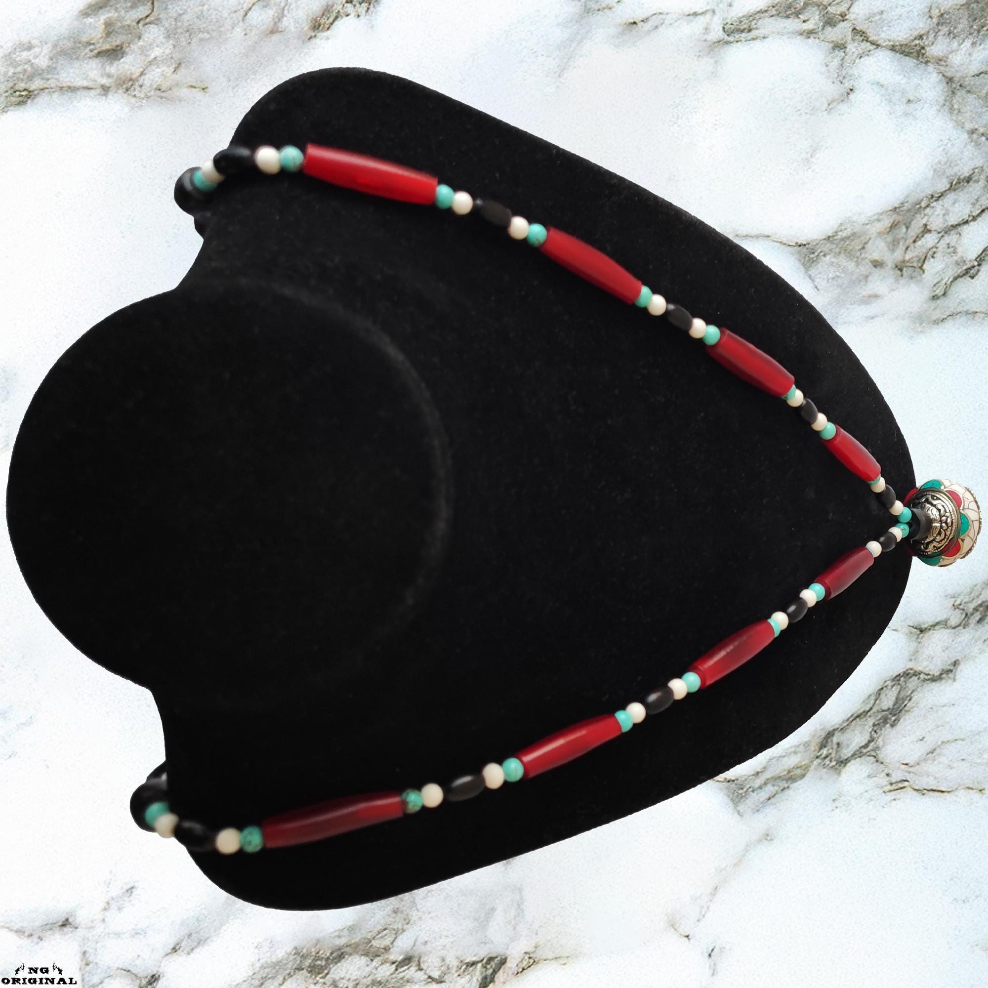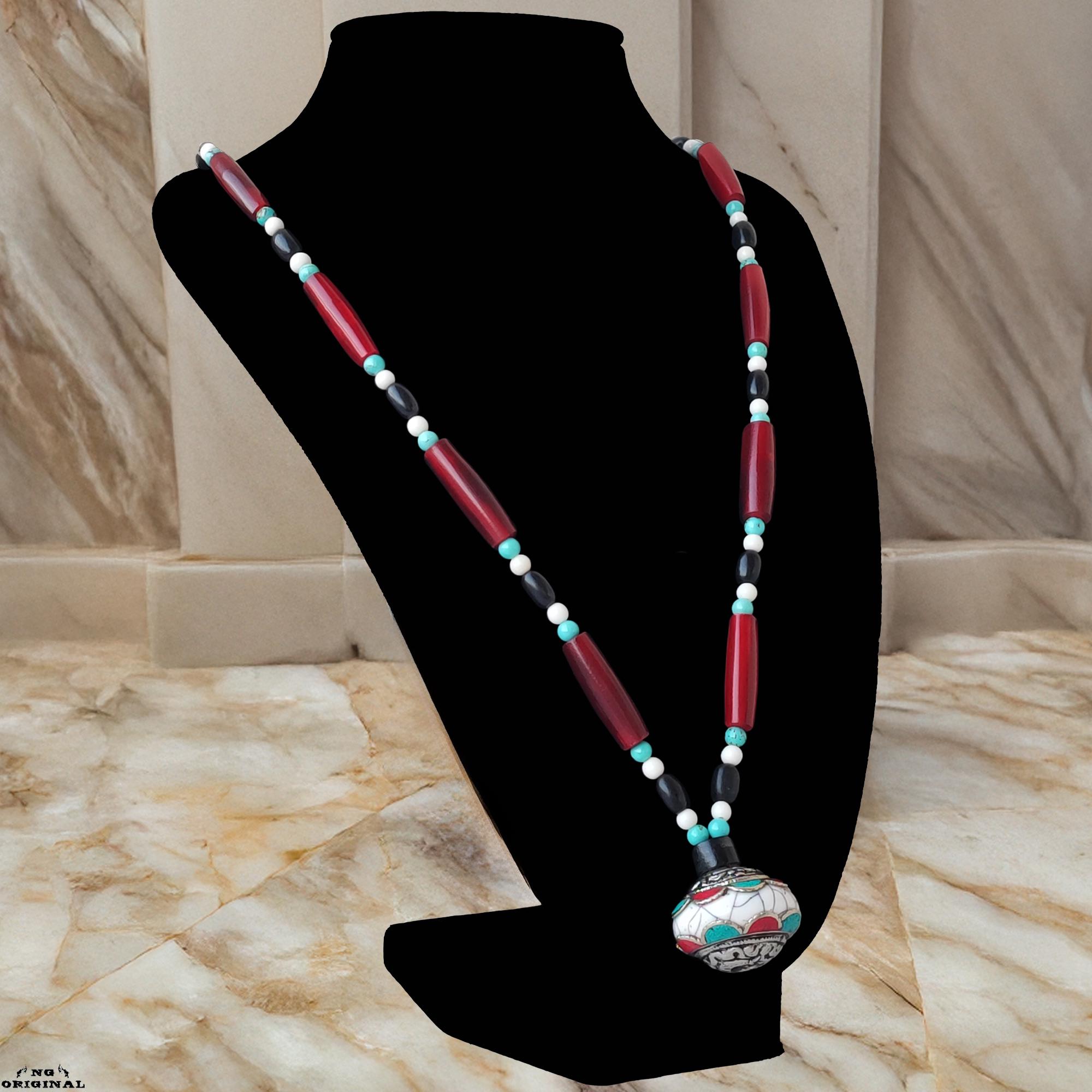 🌿 Premium & sustainable materials: • Black nylon cord ♻️ • Black & red horn beads 🔴⚫ • Ivory-toned wood beads 🌳 • Tibetan repoussé pendant in 925 sterling silver, coral & turquoise 💠