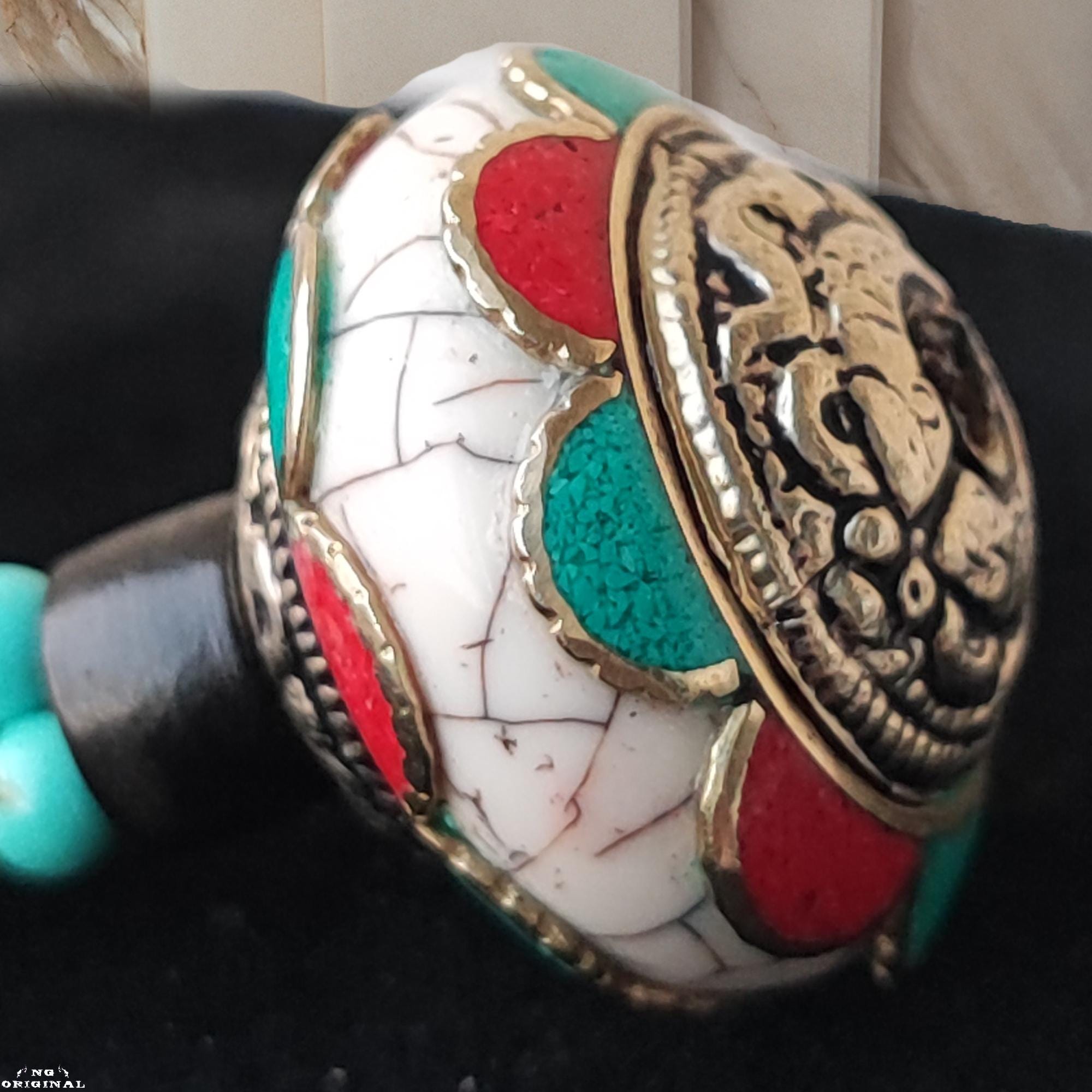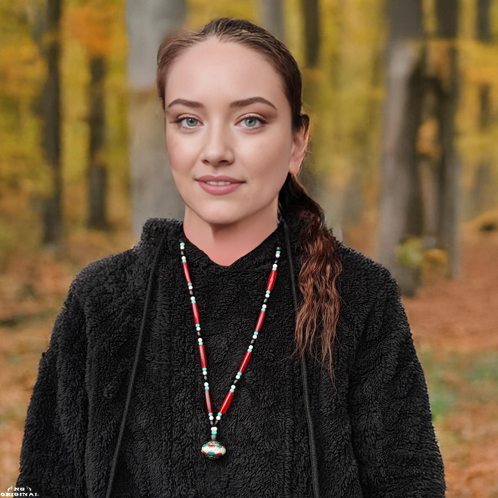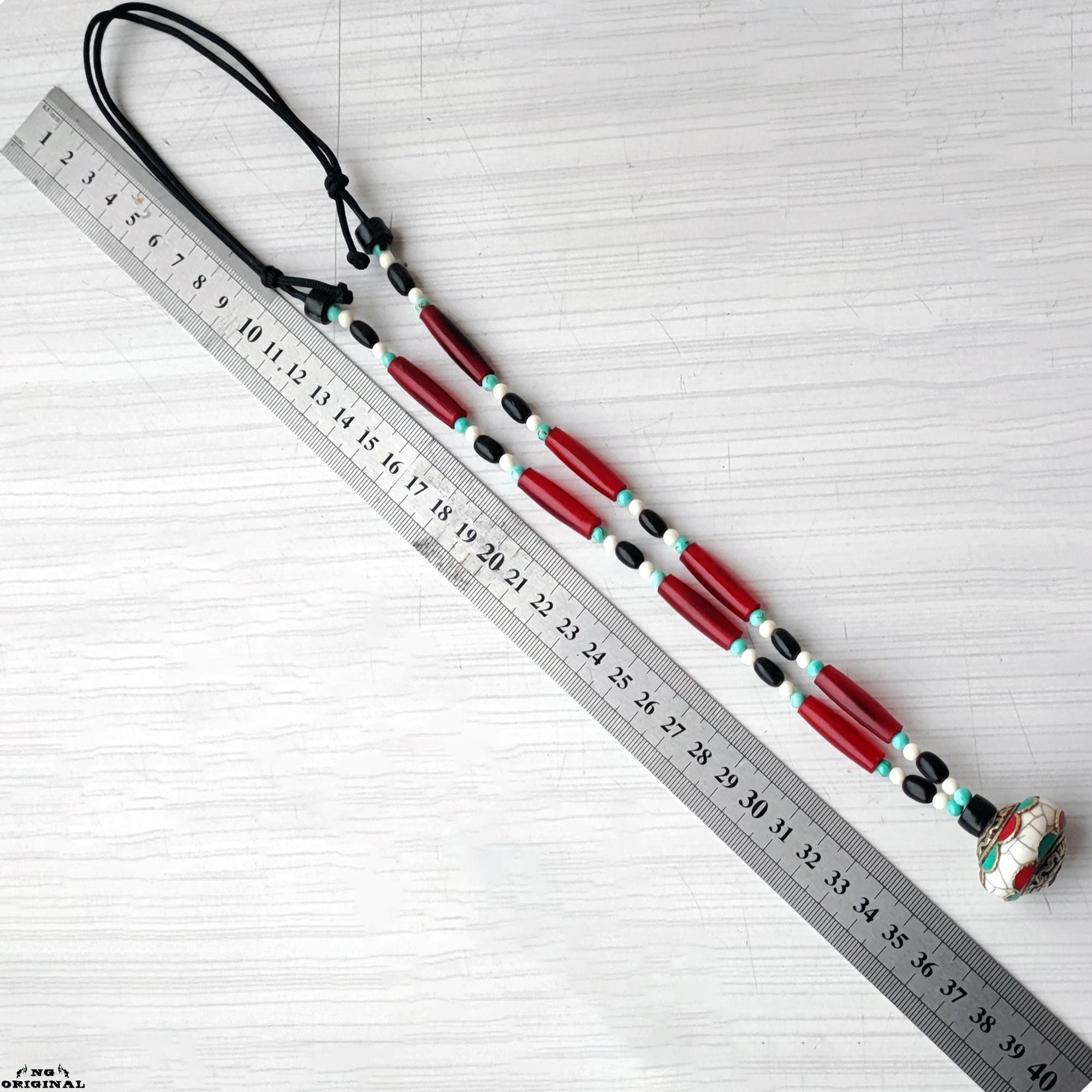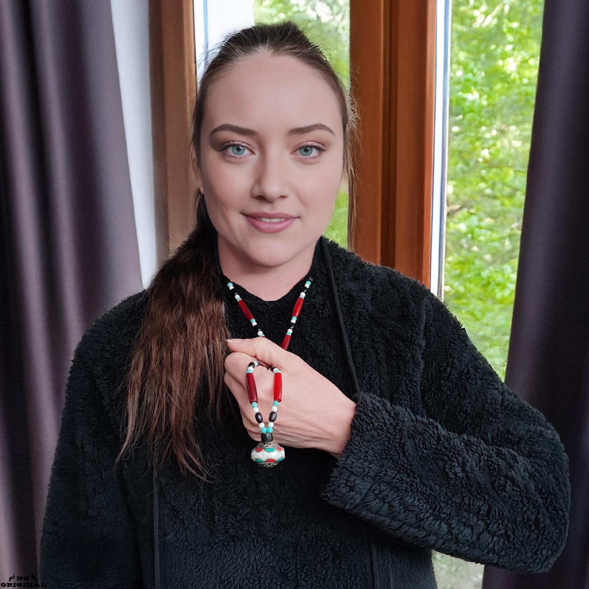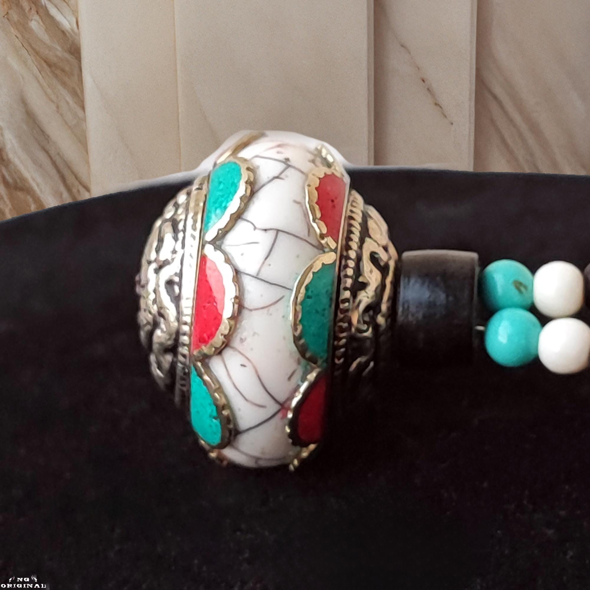 🌿 Premium & sustainable materials: • Black nylon cord ♻️ • Black & red horn beads 🔴⚫ • Ivory-toned wood beads 🌳 • Tibetan repoussé pendant in 925 sterling silver, coral & turquoise 💠