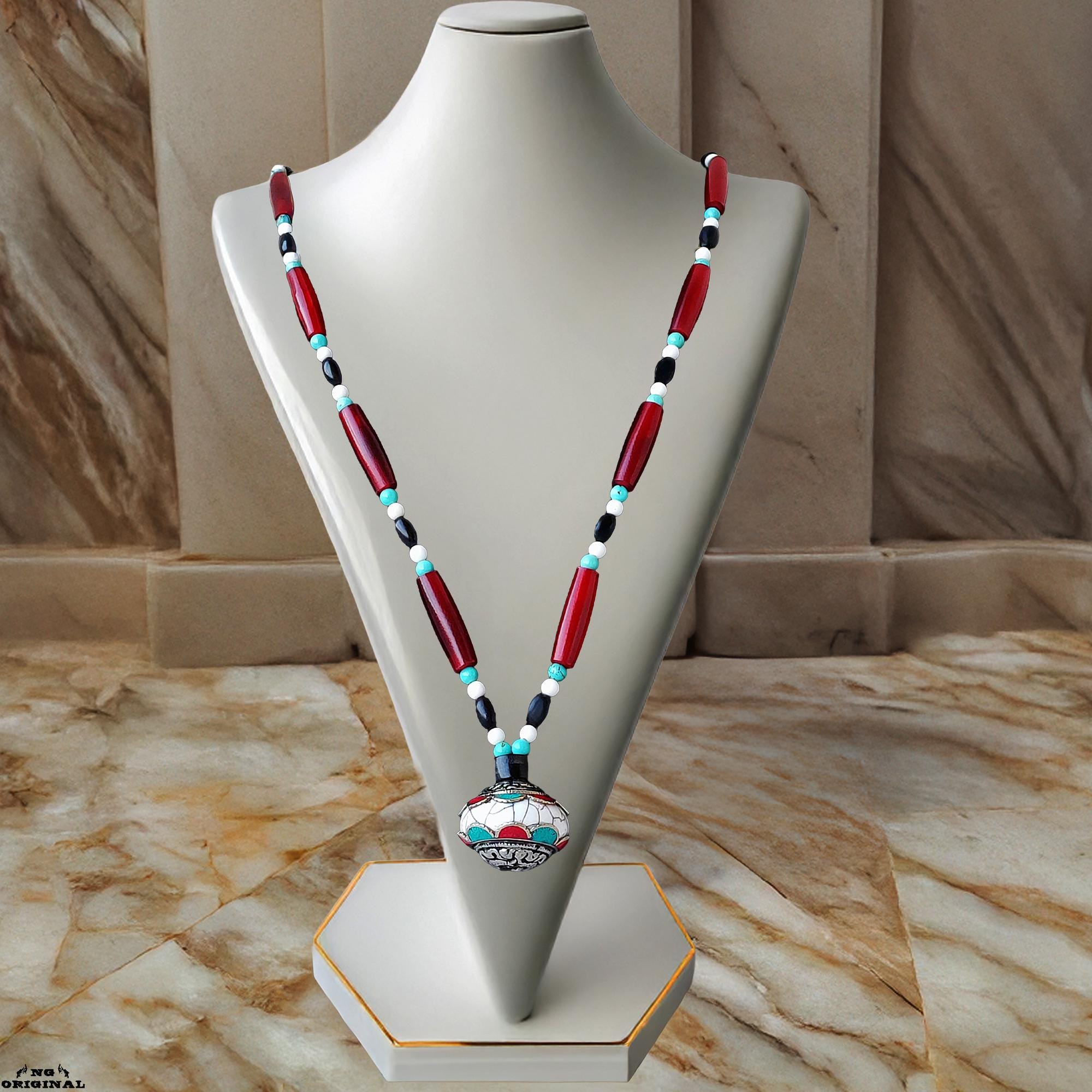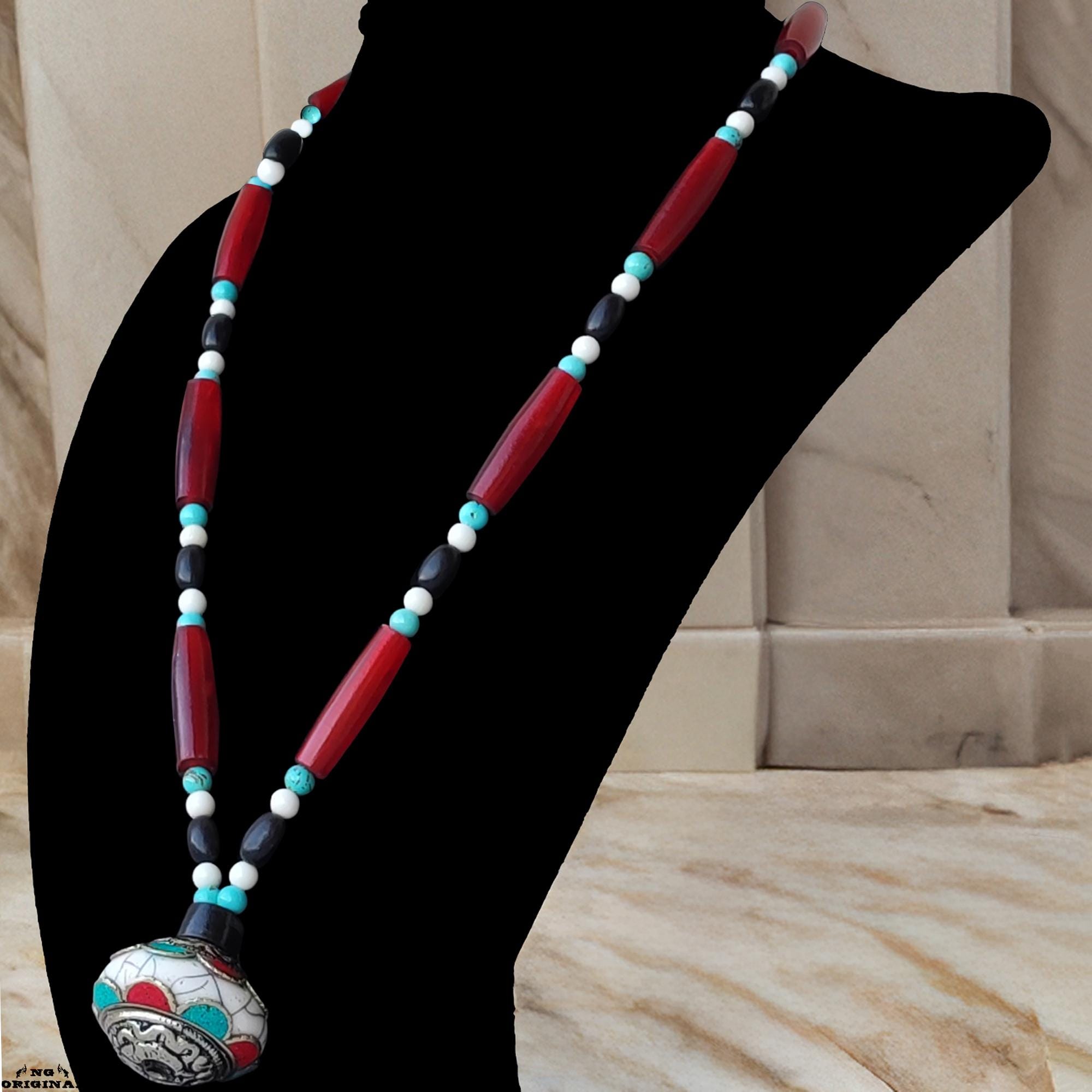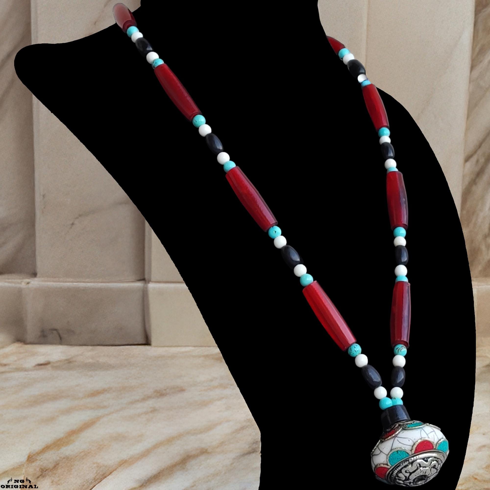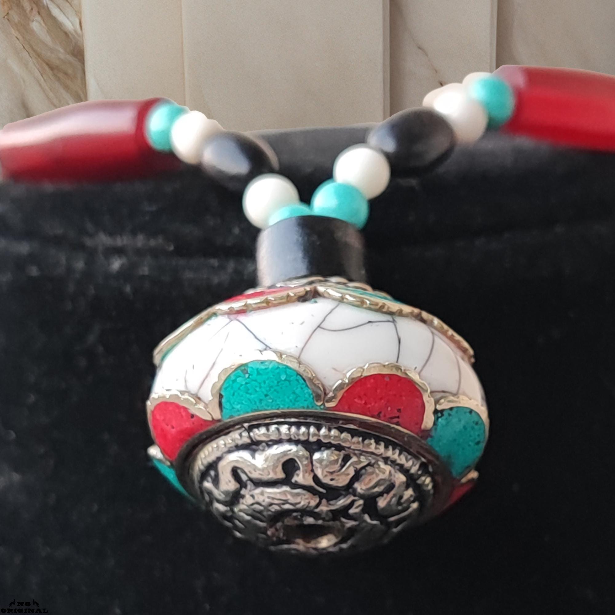 Boho Native American Necklace – Tibetan Pendant in Silver, Coral & Turquoise, Handmade Spiritual Tribal Jewelry, Artisan Gift from France