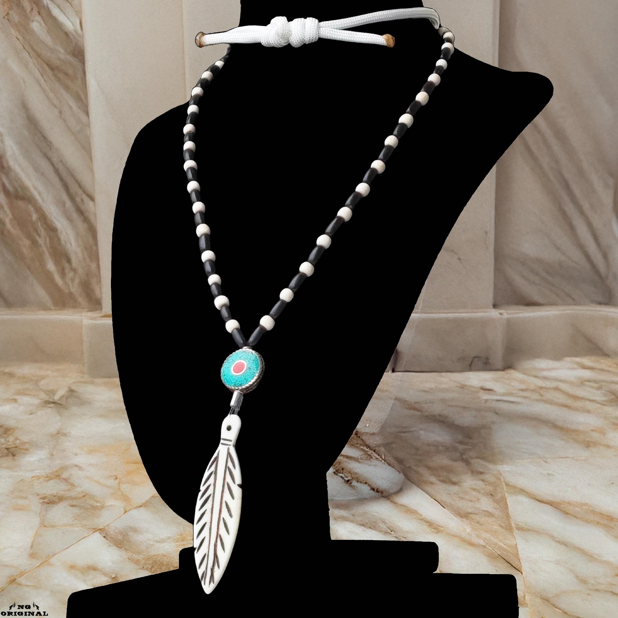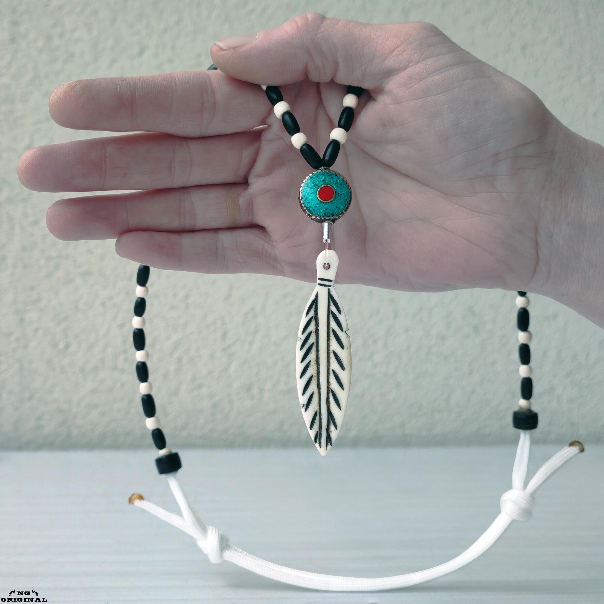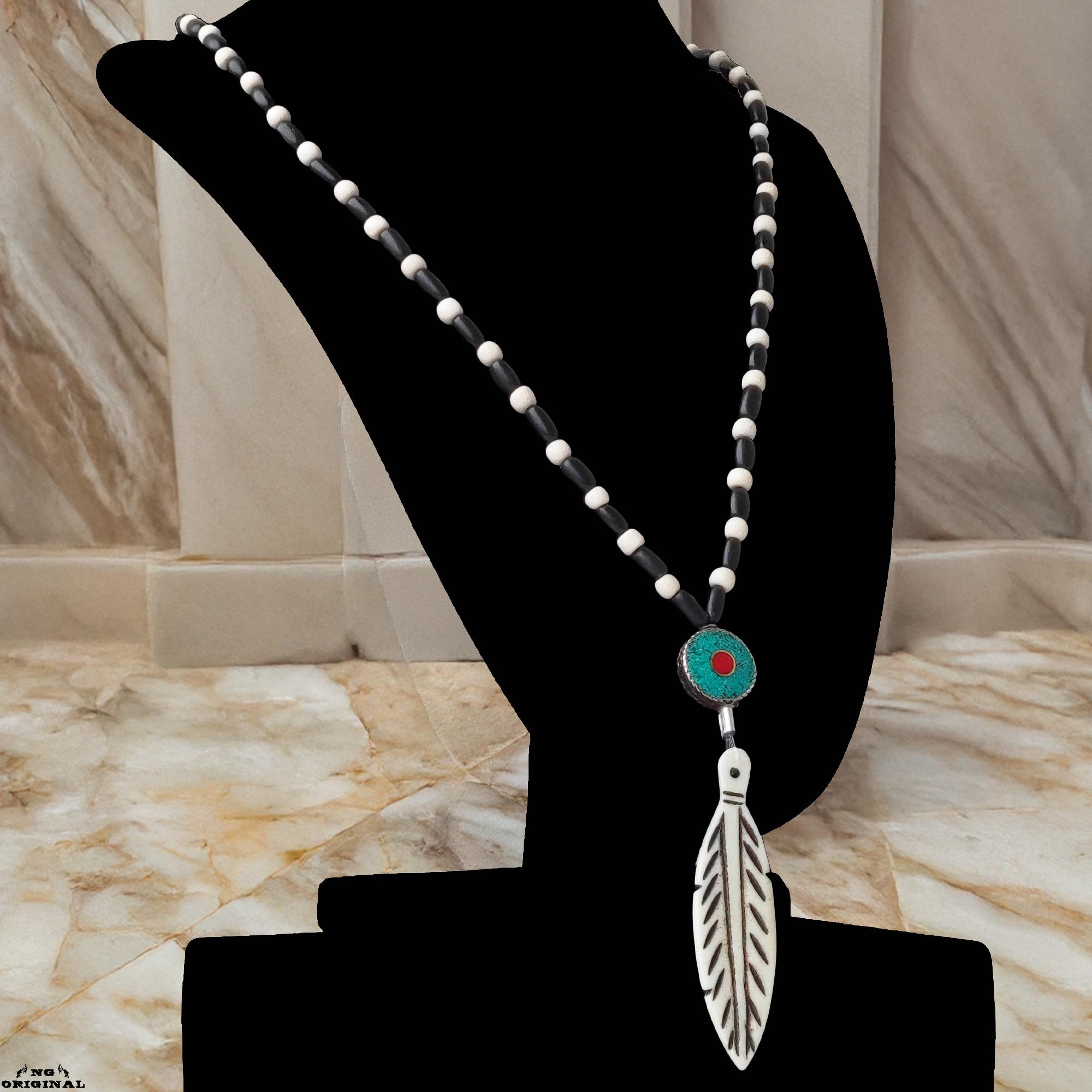 Handmade Native American Necklace • Bone Feather Pendant • Turquoise Coral Beads • Shamanic Protection • Boho Unisex Jewelry