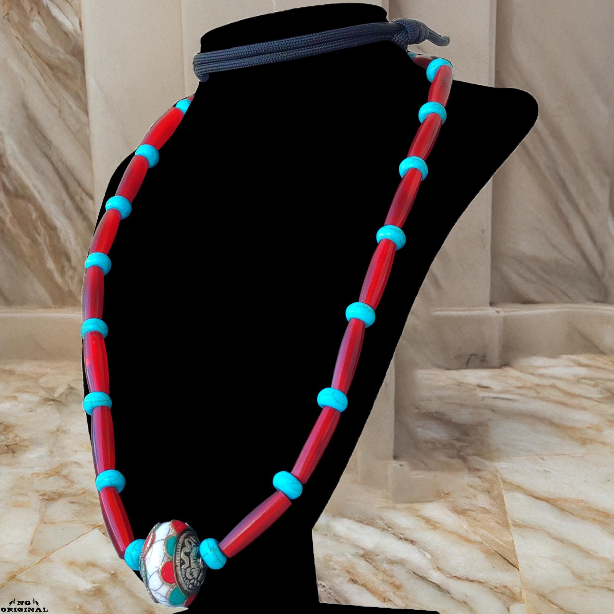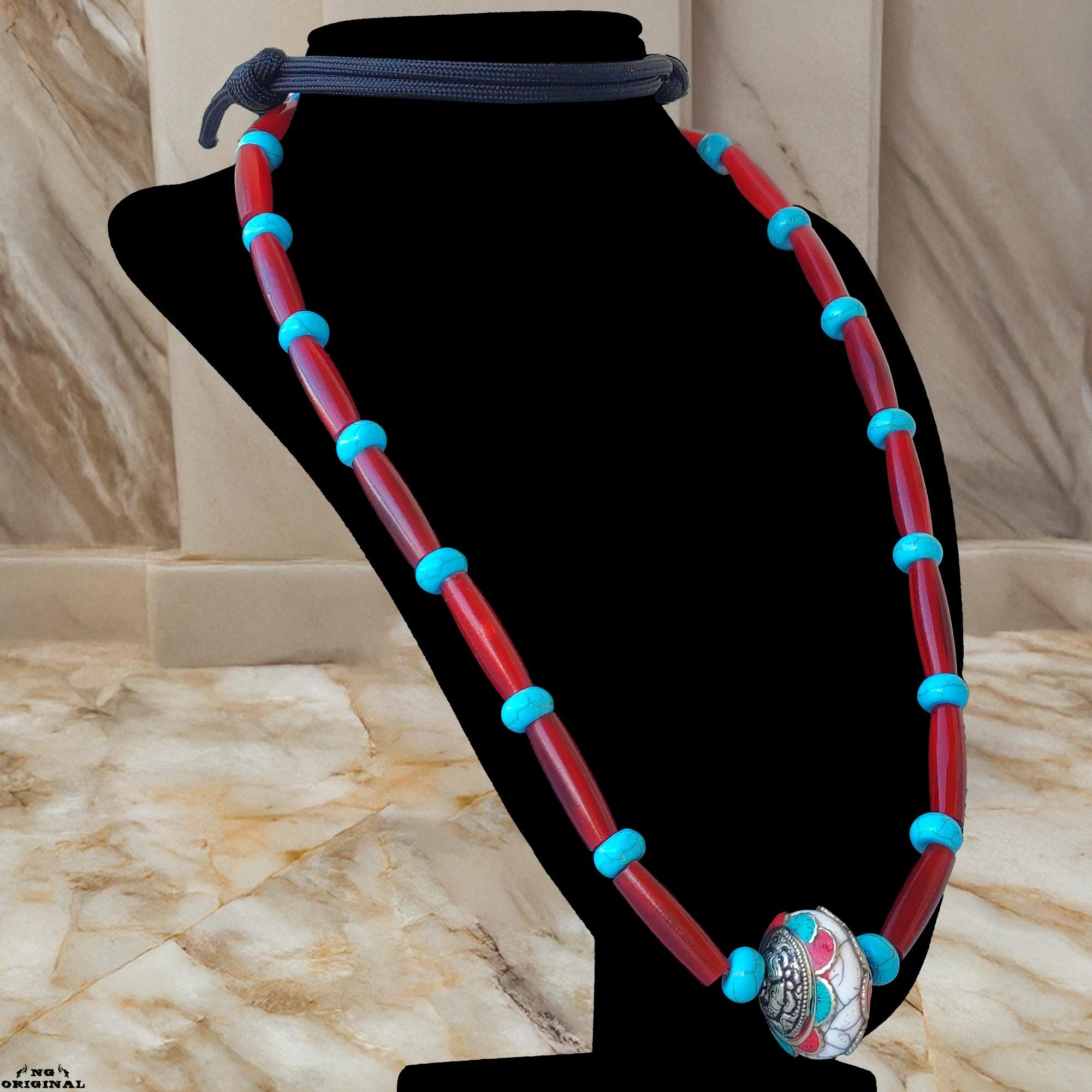 Boho Native Necklace • Tibetan Silver Pendant with Coral & Turquoise • Tribal Spiritual Jewelry Handmade in France